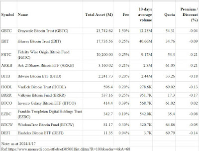 (只限Patreon收費會員:我將這11檔比特幣ETF的詳細比較工作表附在文後,大家有興趣可以下載進一步研究,資料截至2024年4月17日)。